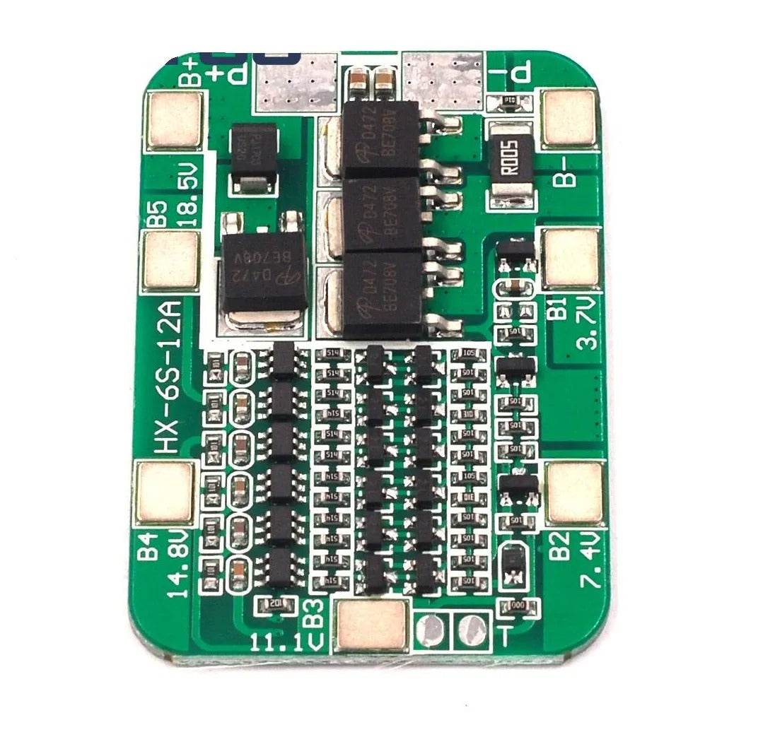 PCB BMS 6 Series 22V 18650 Lithium Battery Protection Board is a 6 string 22V circuit power tool mostly used for solar lighting, for dedicated 18650 battery packs. It is designed for 3.7V 18650 models lithium batteries for charging, Protection from overcharge and over-discharge. Battery protection board, as the name suggests battery protection board is mainly rechargeable (Refers to the lithium battery) and protects the integrated circuit board. Lithium battery (rechargeable type) so need protection, is determined by its own characteristics. As the lithium battery, its material determines itself can not be overcharge, over-discharge, overcurrent, short circuit, and ultra-high temperature charge and discharge, so lithium battery lithium components will always follow A protective plate with a sampling resistor, and a current fuse.