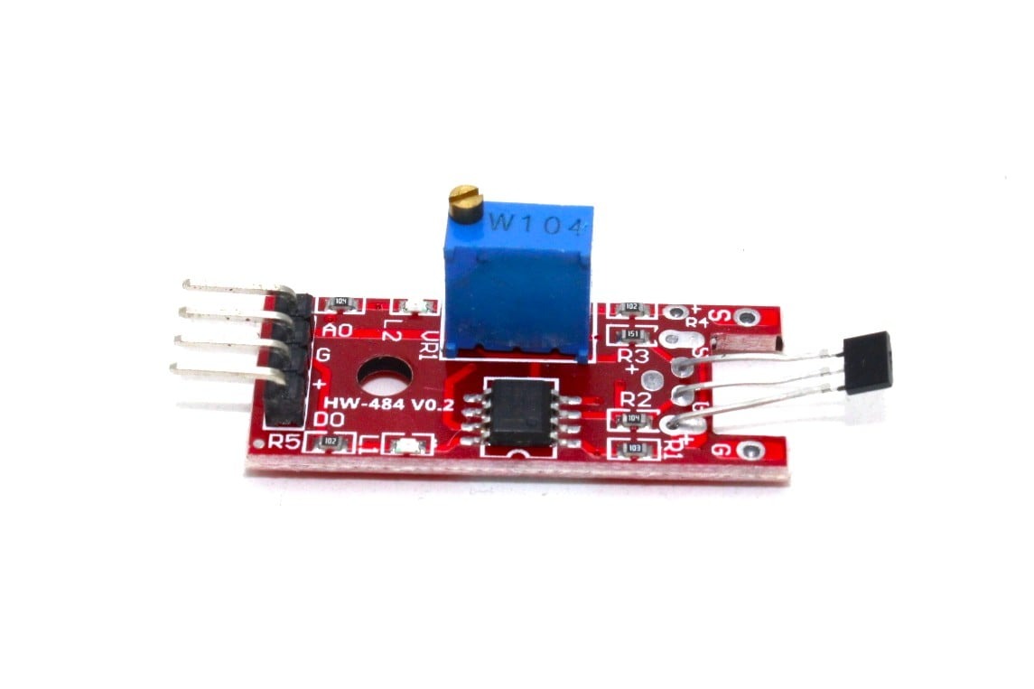 The sensor detects the magnetic field and outputs an analog voltage value. You can adjust the sensitivity of the sensor using a potentiometer.